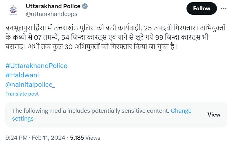 उत्तराखंड के हल्द्वानी के बनभूलपुरा में हुई हिंसा के बाद पुलिस लगातार उपद्रवियों को पकड़ने में लगी है। अभी तक नैनीताल पुलिस की कार्रवाई में 30 लोग गिरफ्तार हुए हैं। इनमें से 5 को पहले अरेस्ट किया गया था और 25 की गिरफ्तारी हाल में हुई। पुलिस को जाँच में इनके पास से 7 तमंचे और 54 कारतूस बरामद हुए हैं। इसके अलावा थाने से लूटे गए 99 कारतूस भी पुलिस को इन अभियुक्तों के पास से मिले हैं।