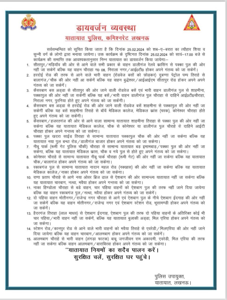 Traffic Diversion In Lucknow: लखनऊ में आज यानी रविवार को शिया सुन्नी वर्ग द्वारा शब-ए-बरात का त्यौहार मनाया जायेगा। इस कार्यक्रम को देखते हुए आज शाम पांच बजे तक कार्यक्रम की समाप्ती तक यातायात व्यवस्था परिवर्तित रहेगी। शहर में भारी वाहनों के प्रवेश पर रोक लगा दी है.