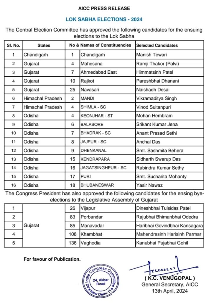 CONGRESS CANDIDATE LIST : कांग्रेस ने शनिवार को लोकसभा चुनाव के लिए एक और उम्मीदवारों की लिस्ट जारी कर दी हैं, 16 नामो की इस लिस्ट में चंडीगढ़ लोकसभा सीट के अलावा, गुजरात की चार, हिमाचल प्रदेश की दो और ओडिशा की नौ लोकसभा सीट के लिए उम्मीदवारों का एलान किया गया है.
