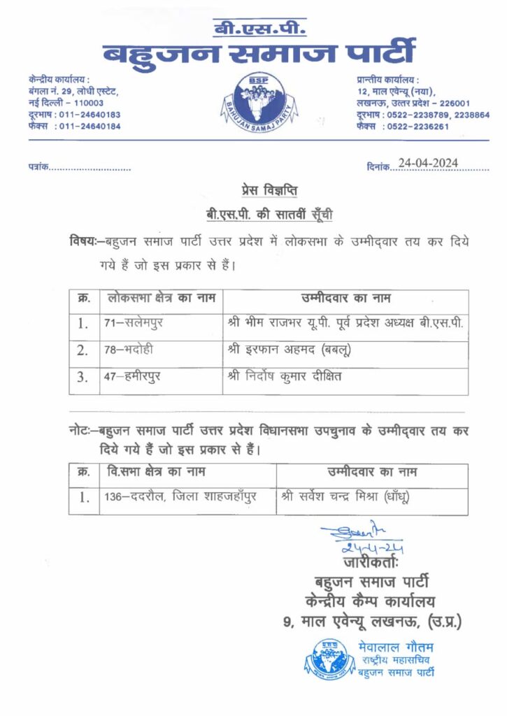 BSP CANDIDATE LIST: बुधवार को लोकसभा चुनाव की बहुजन समाज पार्टी ने प्रत्याशियों की सातवीं सूची जारी कर दी हैं, जिसमे, सलेमपुर से भीम राजभर, भदोही से इरफान अहमद और हमीरपुर से निर्दोष कुमार दीक्षित को उतारा गया है. साथ ही साथ विधानसभा उपचुनाव के लिए सर्वेश चंद्र मिश्रा को शाहजहांपुर की ददरौला सीट से टिकट दिया गया है.