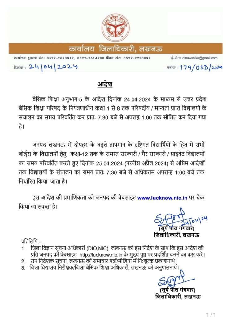 कक्षा 12वीं तक के सभी स्कूलों पर लागू होगा यह आदेशजनपद लखनऊ में दोपहर के बढ़ते तापमान को ध्यान में रखते हुए छात्रों की सेहत को ध्यान में रखते हुए में सभी बोर्ड के कक्षा-12वी तक के समस्त सरकारी/ गैर सरकारी / प्राइवेट विद्यालयों का समय परिवर्तित करते हुए दिनांक 25.04.2024 (पच्चीस अप्रैल 2024) से अग्रिम आदेशों तक विद्यालयों के संचालन का समय प्रातः 7:30 बजे से अधिकतम दोपहर 1:00 बजे तक निर्धारित किया जाता है।