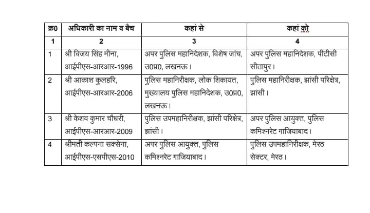 लखनऊ। उत्तर प्रदेश की योगी आदित्यनाथ सरकार ने भारतीय पुलिस सेवा (आईपीएस) के चार वरिष्ठ अधिकारियों का तबादला कर दिया है। आधिकारिक प्रवक्ता ने बुधवार को बताया कि अपर पुलिस महानिदेशक विशेष जांच विजय सिंह मीना को पीटीसी सीतापुर में अपर पुलिस महानिदेशक के पद पर भेजा गया है।